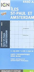 Cette carte IGN Série Bleue de 2012 au 1/25000e montre les iles voisines de St-Paul et Amsterdam, situées au nord-est des Kerguelen. Ces iles volcaniques australes, presque inhabitées (juste une base sur Amsterdam), sans arbres et balayées par le vent font ici l'objet d'une carte détaillée élaborée avec le même soin que les cartes Série Bleue et TOP25 de la métropole et des DOM. Bravo à IGN pour cette initiative pour des sites pourtant très peu touristiques !A noter qu'une carte de même qualité est disponible pour les semblables Iles Crozet (à l'ouest des Kerguelen), ainsi que 2 magnifiques cartes pour les Iles St-Pierre et Miquelon, près du Canada.