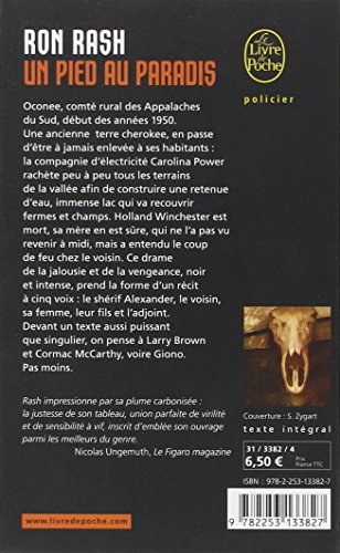 Un pied au paradis (cc) Ron Rash fiche de lecture - Ron Rash Un pied au paradis Le livre de poche 2011--Oconee, comté rural des Appalaches du Sud, début des années 1950. Une ancienne terre cherokee, en passe d'être à jamais enlevée à ses habitants : la compagnie d'électricité Carolina Power rachète peu à peu tous les terrains de la vallée afin de construire une retenue d'eau, immense lac qui va recouvrir fermes et champs. Holland Winchester est mort, sa mère en est sûre, qui ne l'a pas vu revenir à midi, mais a entendu le coup de feu chez le voisin. Ce drame de la jalousie et de la vengeance, noir et intense, prend la forme d'un récit à cinq voix : le shérif Alexander, le voisin, sa femme, leur fils et l'adjoint. Devant un texte aussi puissant que singulier, on pense à Larry Brown et Cormac McCarthy, voire Giono. Pas moins. Rash impressionne par sa plume carbonisée : la justesse de son tableau, union parfaite de virilité et de sensibilité à vif, inscrit d'emblée son ouvrage parmi les meilleurs du genre. Nicolas Ungemuth, Le Figaro magazine.---------